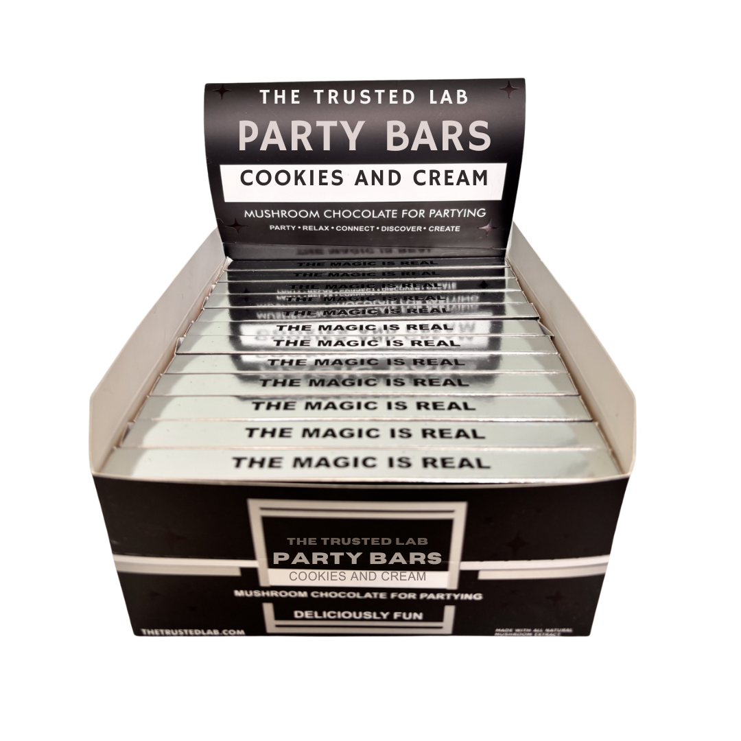The Trusted Lab Cookies & Cream Microdose Party Bars deliver a rich, dessert-style chocolate experience and a sober-friendly way (for many customers) to keep the mood elevated—without alcohol. We craft these bars in the USA, lab test them, and make them with high-quality, all-natural ingredients and our proprietary mushroom nootropic blend—free of synthetic substances.