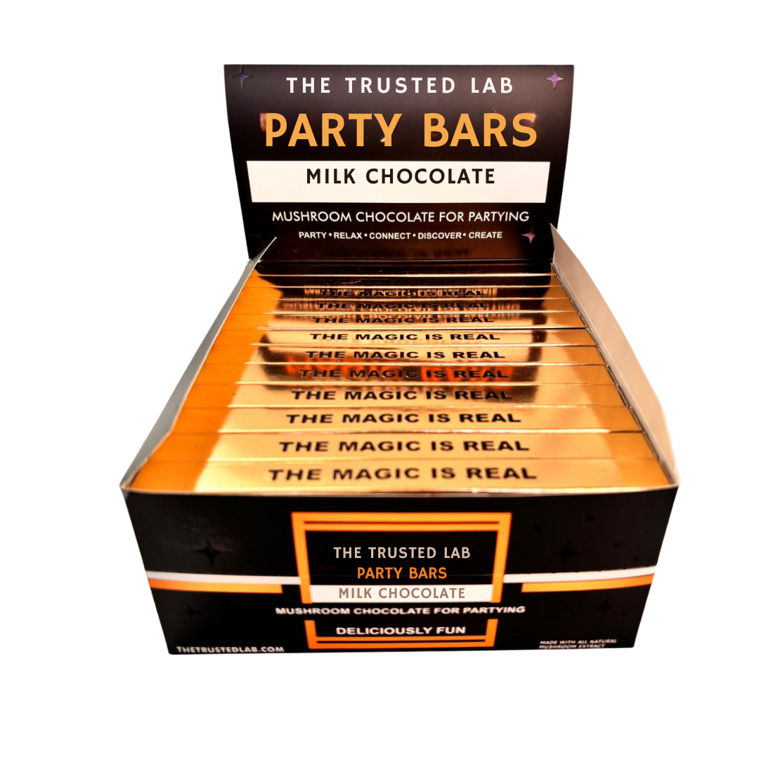 The Trusted Lab Chocolate Microdose Party Bars support an uplifting, sober-friendly experience that many customers enjoy anytime—for a creative afternoon, a social moment, or a mood-boosting reset. We lab test our Party Bars and craft them in the USA with high-quality, all-natural ingredients and our proprietary mushroom nootropic blend—free of synthetic substances.